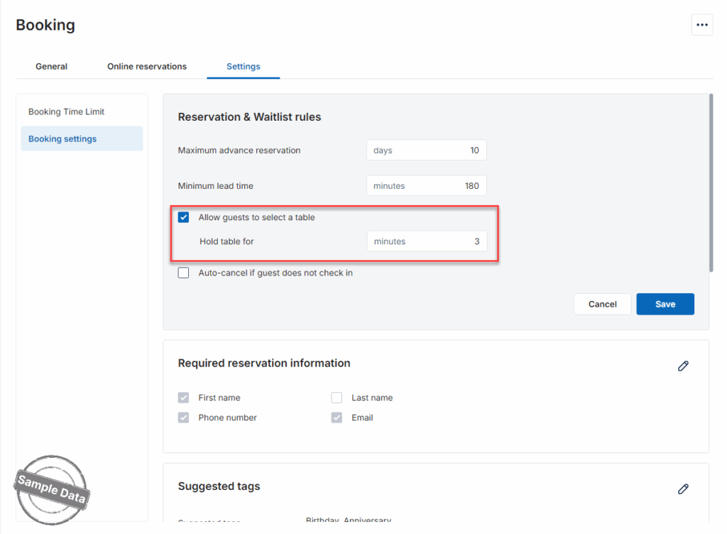 Check Allow guests to select a table and set up the time to hold the table.