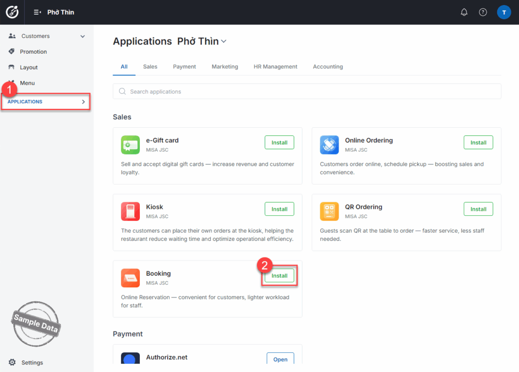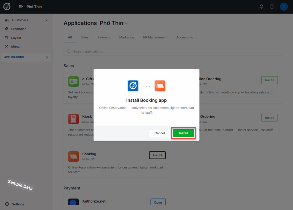 On Applications tab, click Install at Booking.