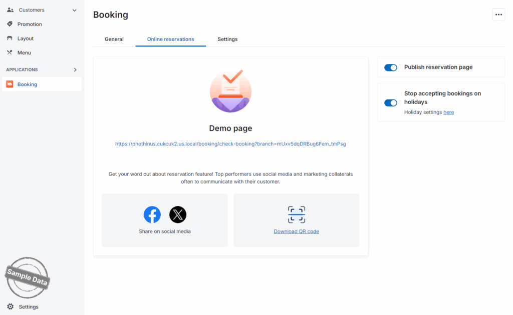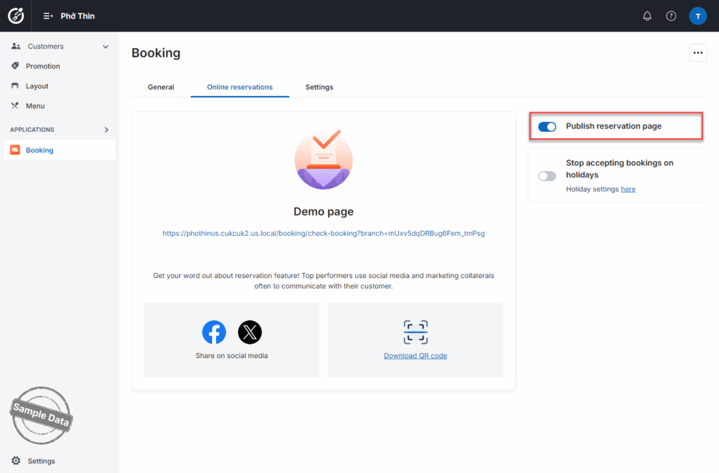 If the restaurant offers online reservation, go to Online reservation tab and turn on Publish reservation page.