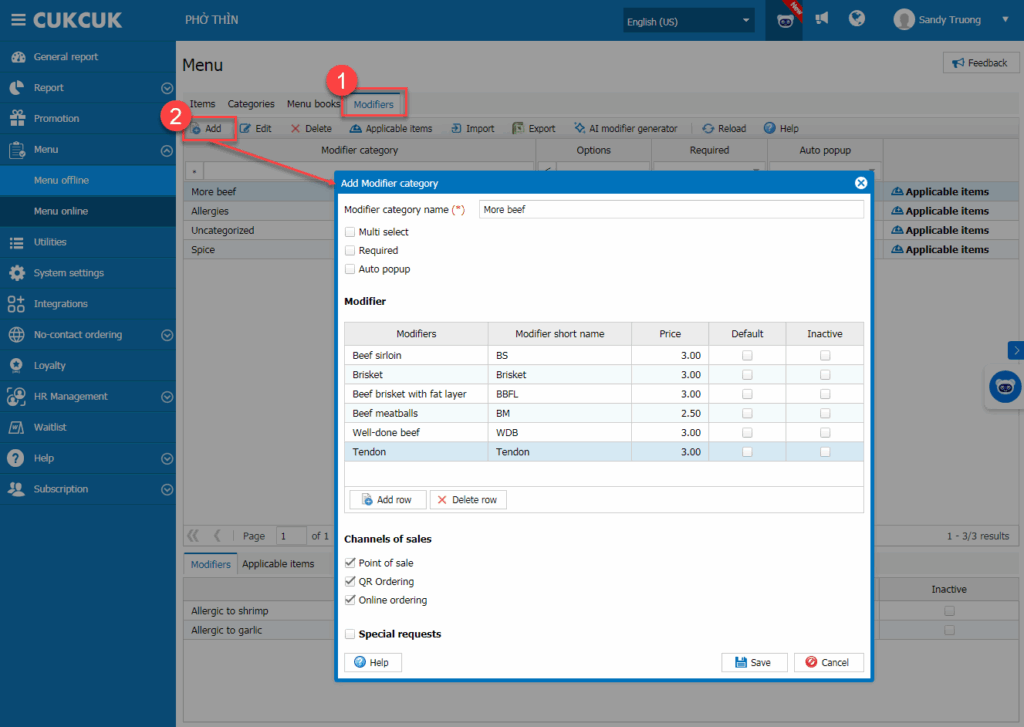 Để thêm STPV mới, đi đến tab Modifiers và nhấn Add. Điền thông tin STPV. Điền tên viết tắt của STPV để nhân viên có thể chọn nhanh.