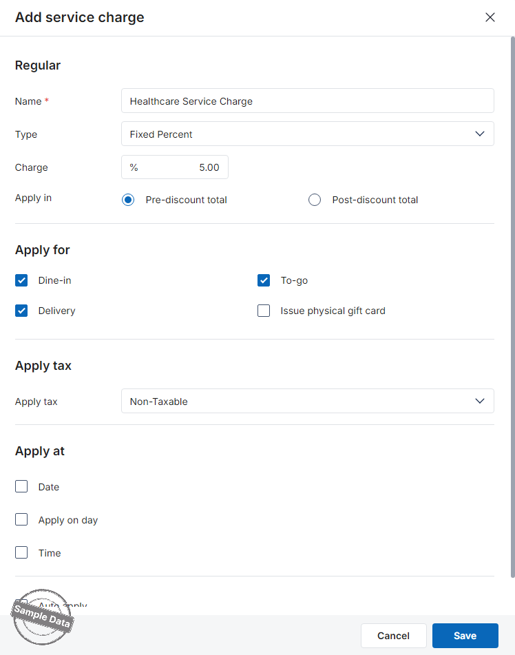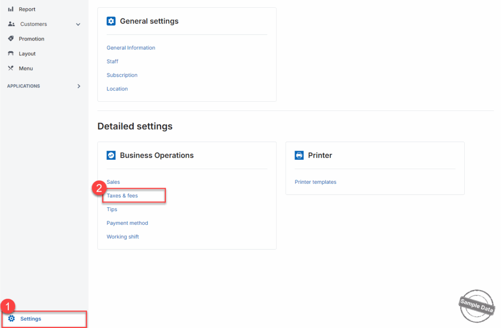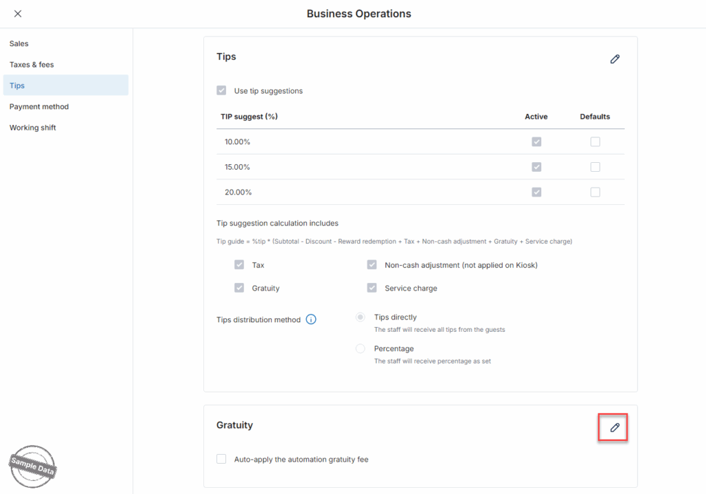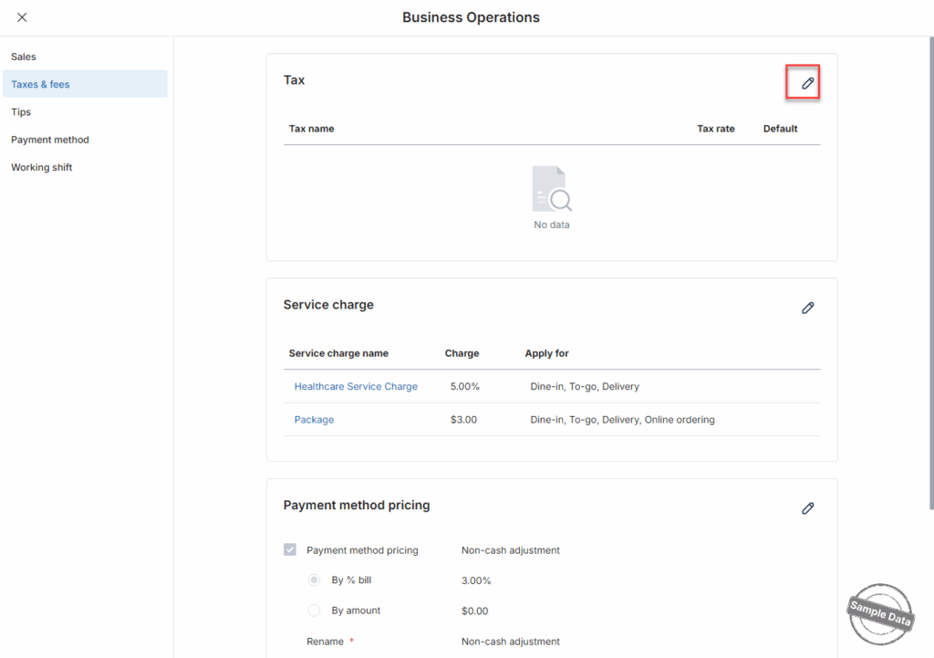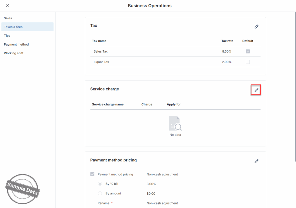 The managers can configure settings related to purchasing and sales operations such as pricing policies, fees, taxes, and gratuity. Depending on the configuration, the purchasing and sales screens and related functions in the system will change accordingly.