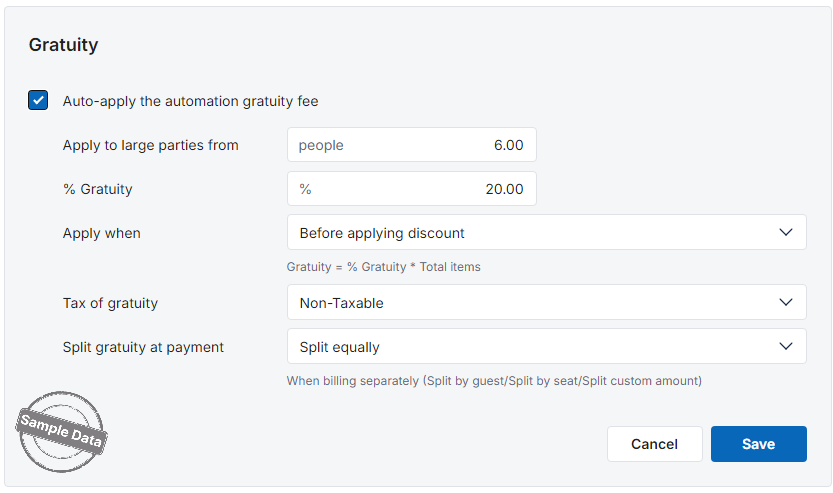 Check Auto-apply the automation gratuity fee to larger parties of, and enter the number of guests.