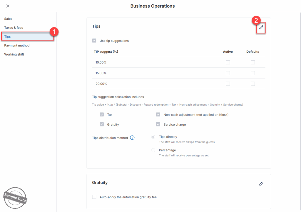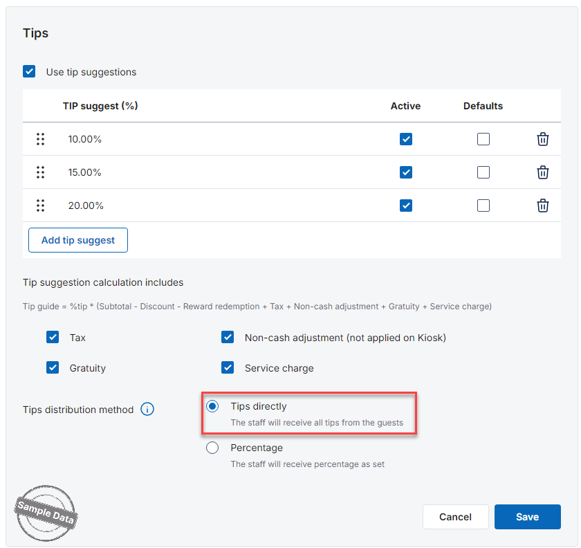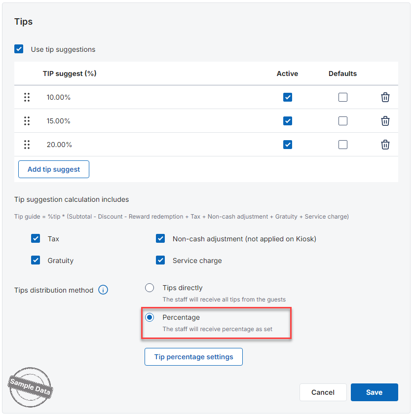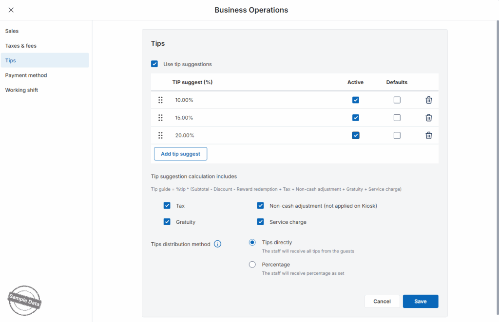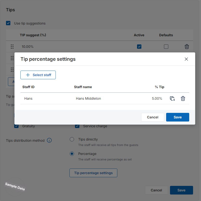 • The system will suggest tip levels in percentage (%). Managers can choose which tip levels to display.
