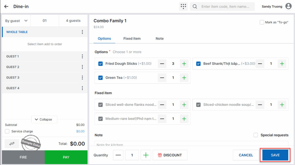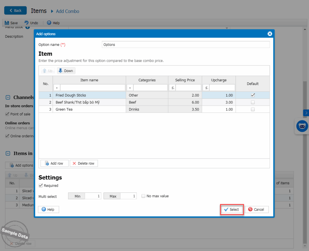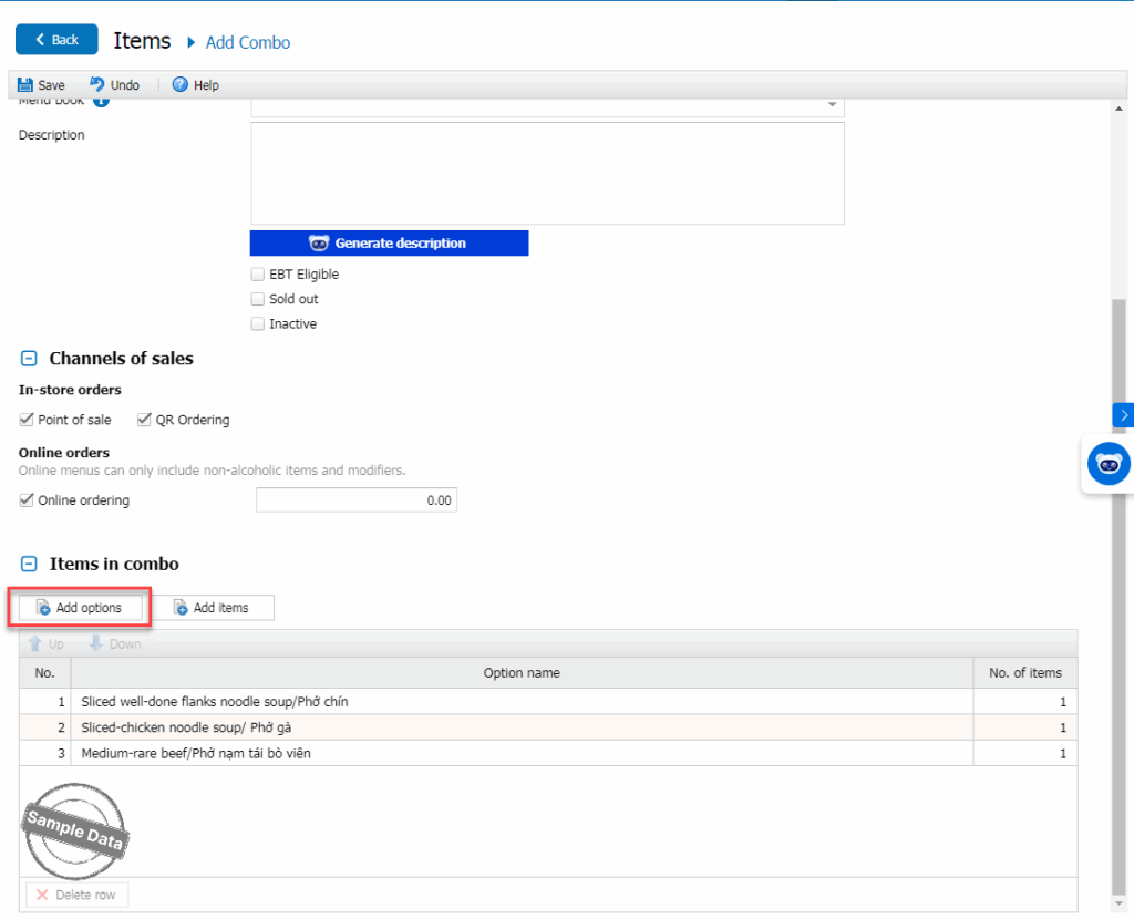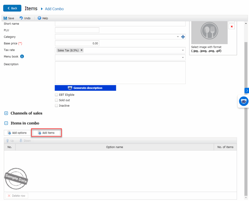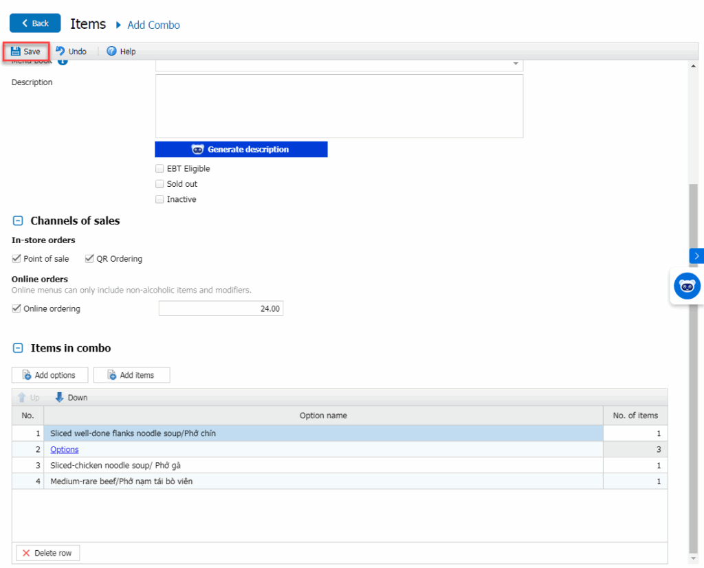 After entering combo information, scroll down to Items in combo. To add items required in the combo, click Add items.